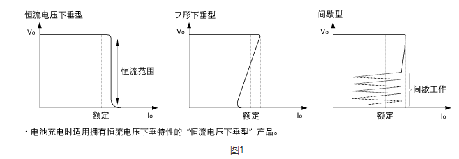 圖1中有三個主電源的過流保護(hù)特性。其中,適合電池充電的方式是擁有恒流電壓下垂特性的電源。通過運(yùn)用其恒流范圍,可以對電池進(jìn)行恒流充電。另外兩個特性不適合對電池充電,所以在選擇電源時要注意。