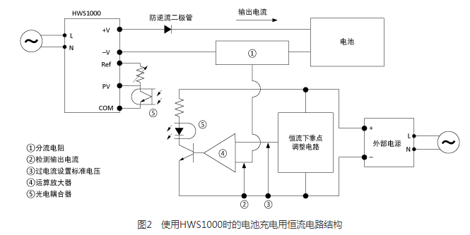 另一種控制恒流的方法是將外部電路連接到電源上,而不是像前面解釋的那樣通過過流保護(hù)轉(zhuǎn)移電流。以TDK的HWS1000為例來解釋這個過程:并聯(lián)電阻應(yīng)用在電源的負(fù)載線上,輸出電流的電壓轉(zhuǎn)換是通過并聯(lián)電阻實現(xiàn)的,并進(jìn)行輸出電流檢測。設(shè)計了恒流下垂點的調(diào)節(jié)電路,并建立了過流的標(biāo)準(zhǔn)電壓。在運(yùn)算放大器中比較(2)和(3)的電壓,在光耦合器中控制電源的輸出電壓。